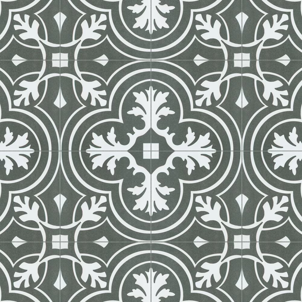 Drawing inspiration from artisan cement tiles, the Merola Tile Twenties Classic Encaustic 7-3/4 in. x 7-3/4 in. Ceramic Floor and Wall Tile exudes encaustic flair. Set on a speckled dark charcoal base, the off-white design features delicate grey freckles, giving this tile subtle definition. Soft, simplistic arcs frame the floral, old-world pattern and rendezvous to reflect Spanish designs. Capturing a sought after designer look, this pattern is great for bringing a custom look to your home for less. With a matte glaze, this artistic tile is an excellent choice for backsplashes, showers, foyers and exterior work. Pair this tile with the rest of the monochromatic, geometric patterned Twenties series or as a dynamic inflection for any application.
