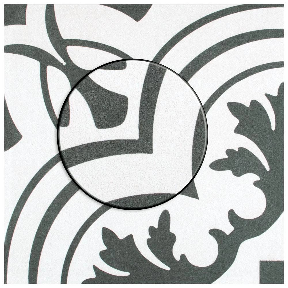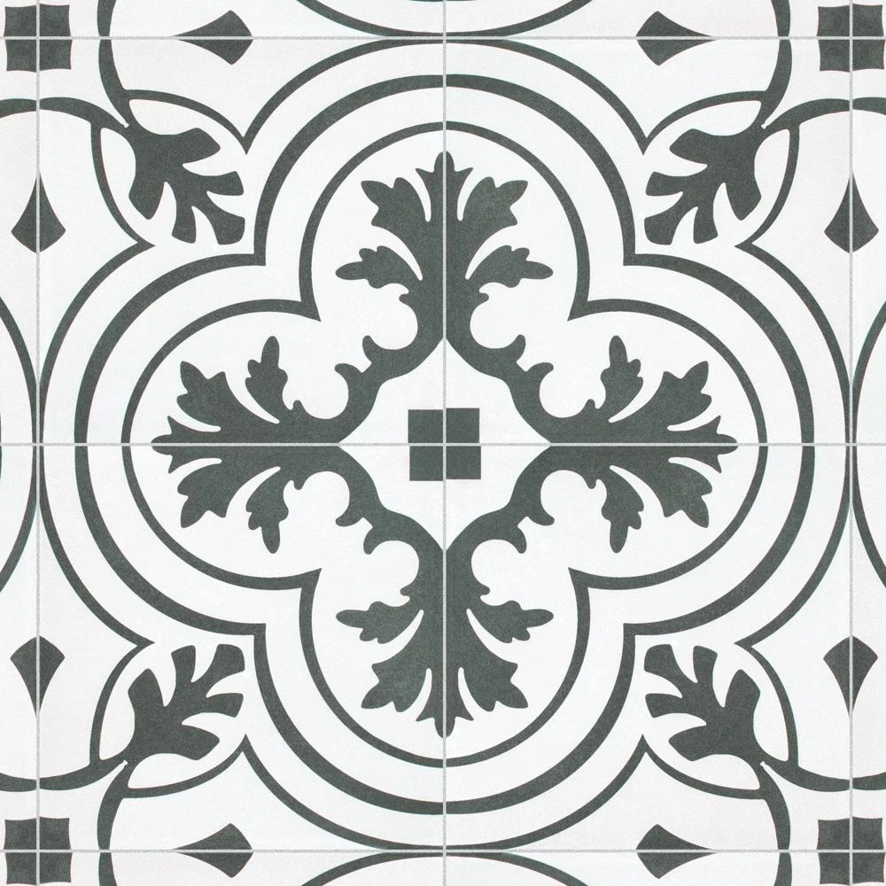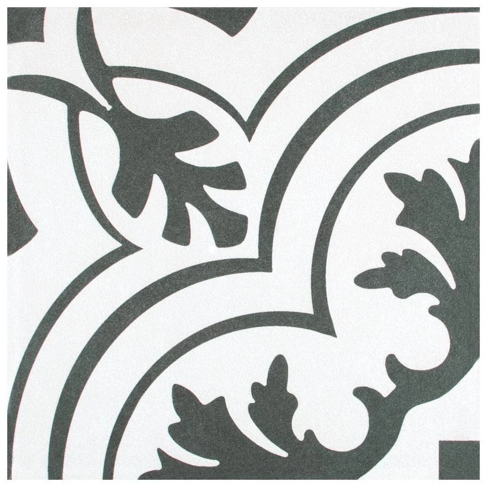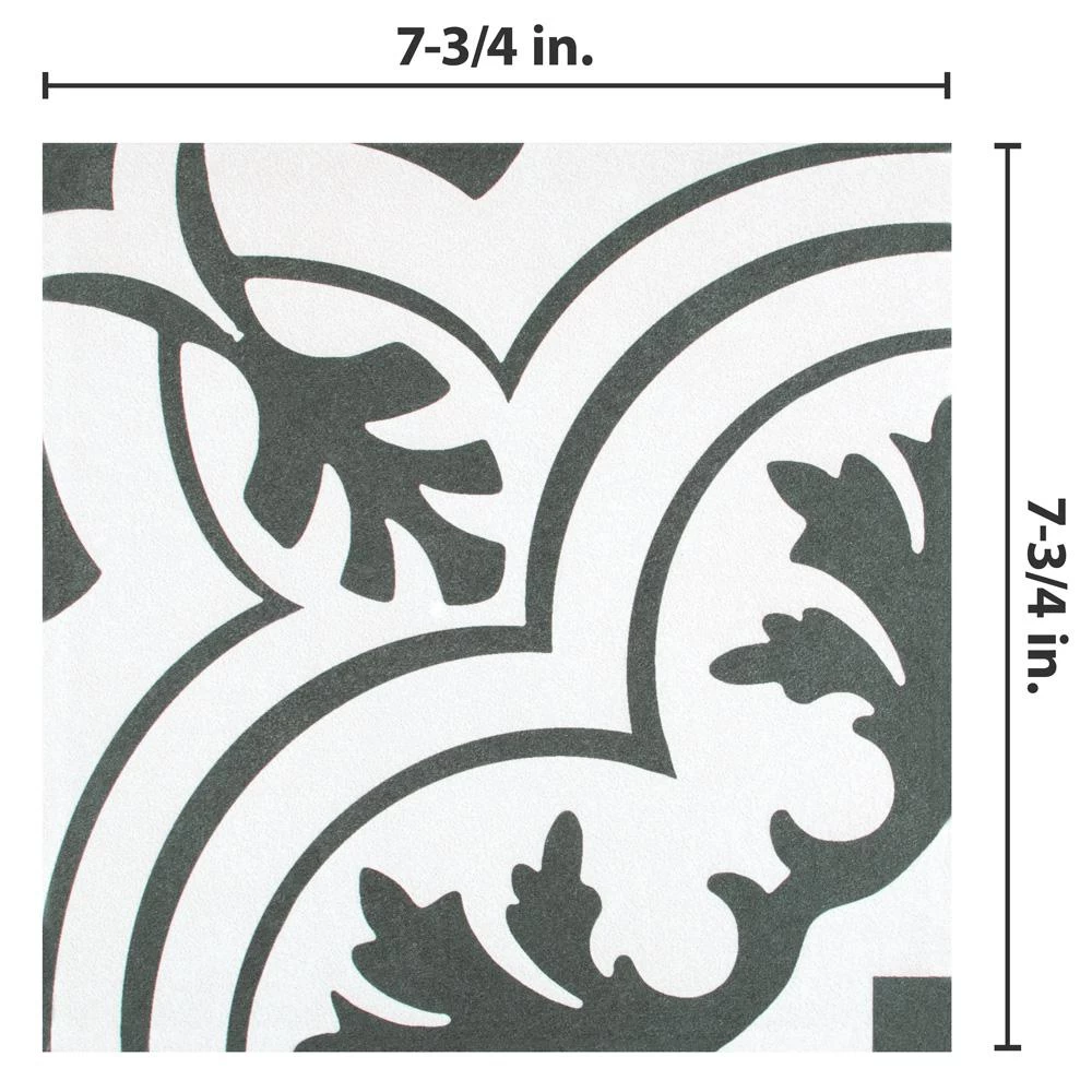 The Merola Tile Twenties Vintage Encaustic 7-3/4 in. x 7-3/4 in. Ceramic Floor and Wall Tile was inspired by artisan cement tiles. The medium-sheen glaze features a vintage floral-inspired pattern in hues of deep charcoal gray on a white background. This tile is perfect for any setting, traditional enough for historical renovations or modern enough for new construction. Use this durable tile with the rest of the geometric patterned Twenties series or as a lively accent for any application to your indoor or outdoor floors and walls.