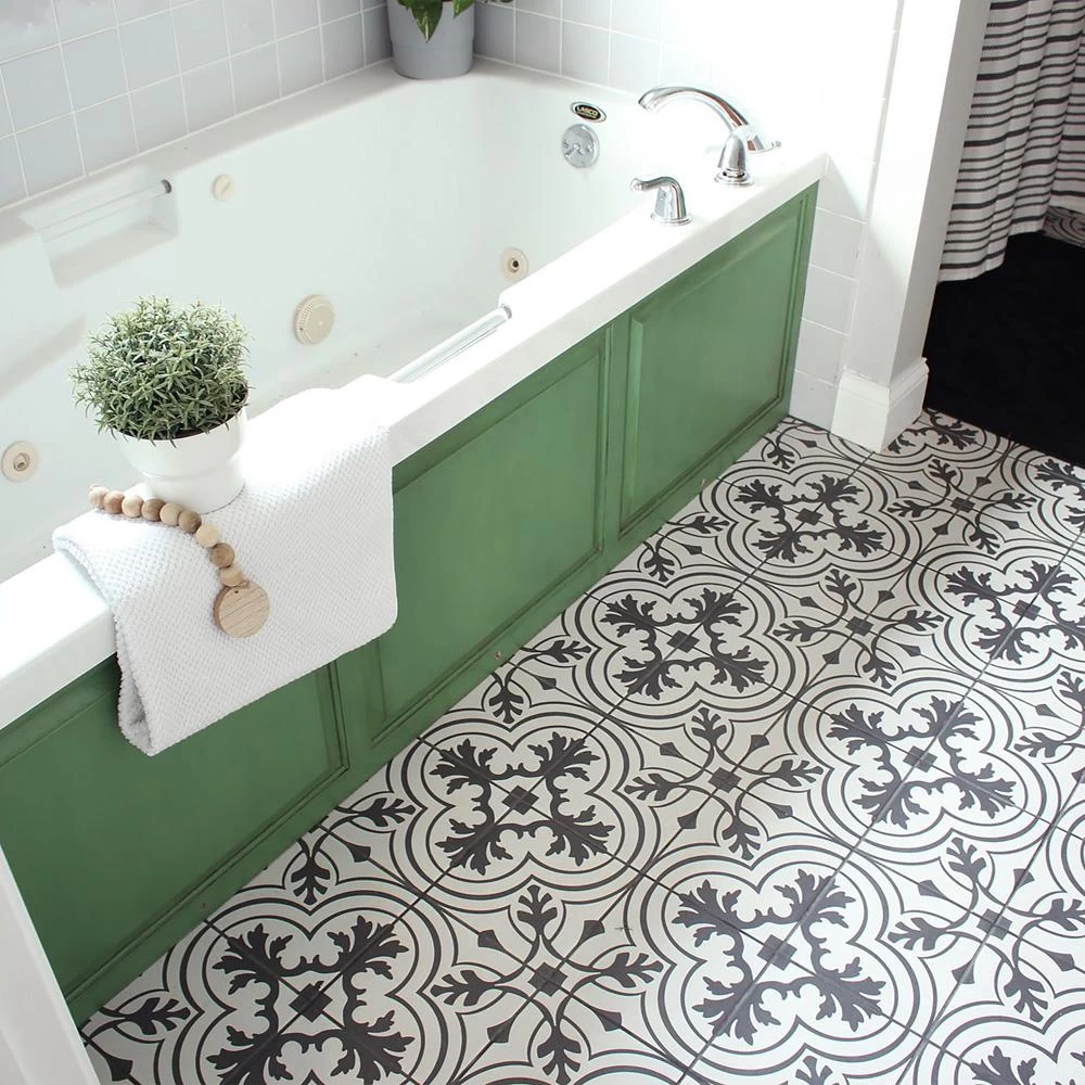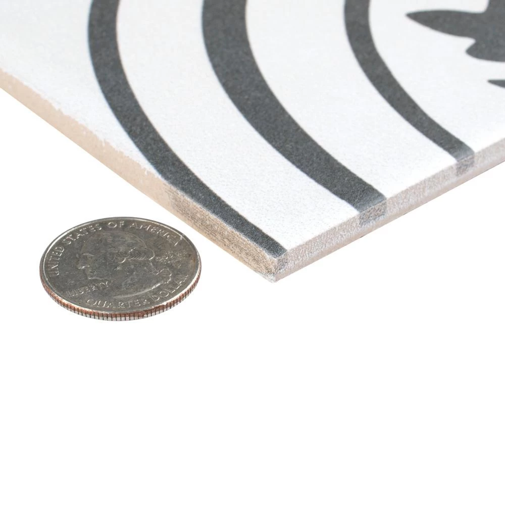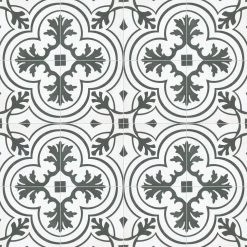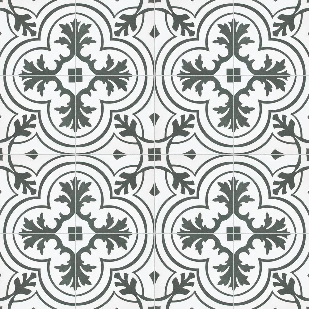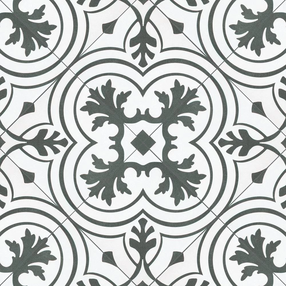 The Merola Tile Twenties Vintage Encaustic 7-3/4 in. x 7-3/4 in. Ceramic Floor and Wall Tile was inspired by artisan cement tiles. The medium-sheen glaze features a vintage floral-inspired pattern in hues of deep charcoal gray on a white background. This tile is perfect for any setting, traditional enough for historical renovations or modern enough for new construction. Use this durable tile with the rest of the geometric patterned Twenties series or as a lively accent for any application to your indoor or outdoor floors and walls.